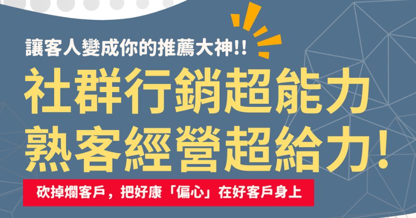 如何快速拓展品牌、提升營業額?手把手教你如何與消費者拉近距離,讓顧客忠心於你!把握機會,即刻報名! 想知道如何讓顧客記得你,經營專屬於你的熟客群嗎?如何快速拓展品牌,運用社群的力量打造品牌聲量? 提升獲利是有技巧的!讓你創業開店輕鬆賺錢!輕鬆提升營業額!線下實體課程名額有限趕快報名! 閱讀更多