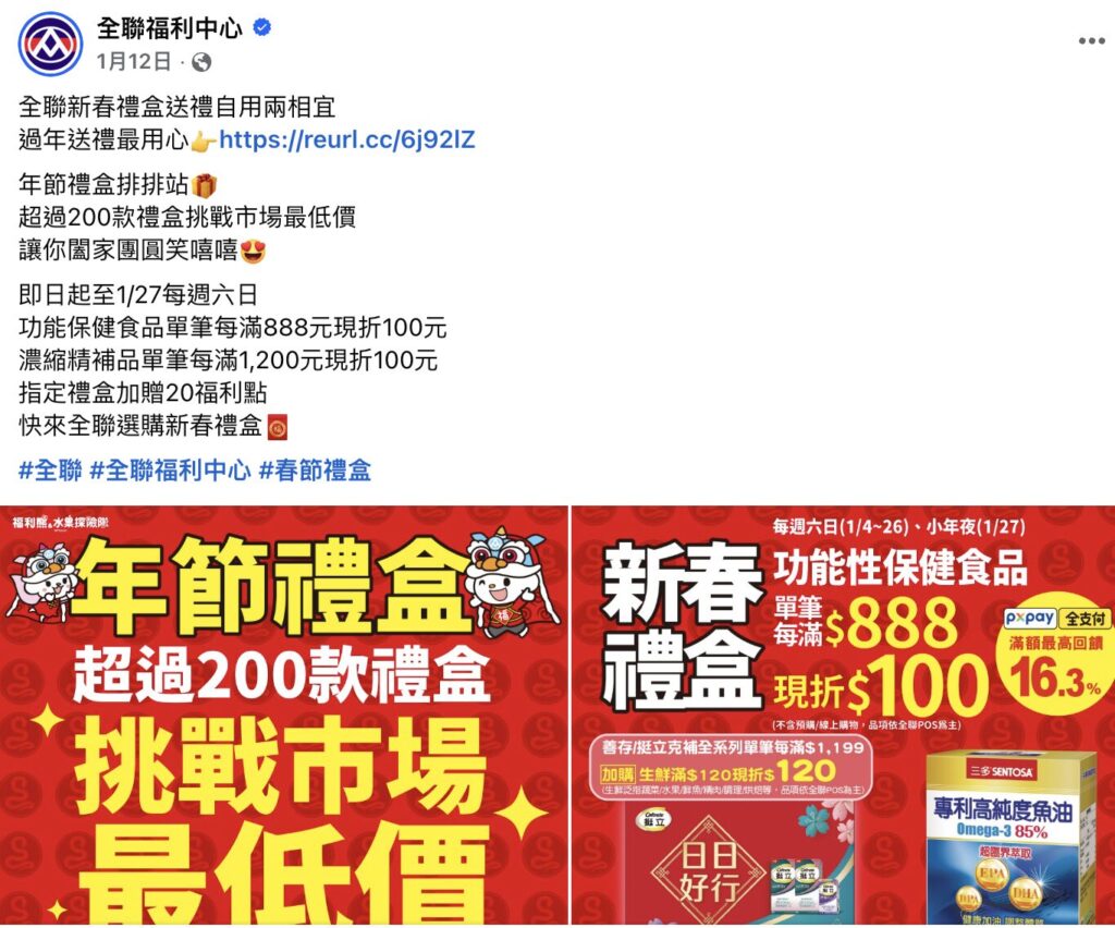 以全聯為例,他們在春節檔期推出「新春禮盒送禮自用兩相宜」的活動貼文,主打超過200款禮盒與多重折扣優惠,並運用可愛表情符號、口語化語氣與「闔家團圓笑嘻嘻」等暖心字眼,營造親切又有節慶感的互動氛圍,這種將情感共鳴與購買動機結合的策略,使全聯成功打造出一場貼近民心的年節行銷,在眾多品牌中脫穎而出!